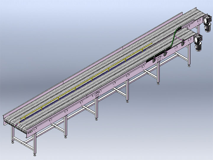 鏈板輸送機(jī)是一種以標(biāo)準(zhǔn)鏈板為承載面,由馬達(dá)減速機(jī)為動力傳動的傳送裝置。鏈板式輸送機(jī),由動力裝置(電機(jī))、傳動軸、滾筒、張緊裝置、鏈輪、鏈條、軸承、潤滑劑、鏈板等等構(gòu)成。其中帶動物料的輸送的主要的兩個(gè)部分為:鏈條,利用它的循環(huán)往復(fù)運(yùn)動提供牽引動力;金屬板,作為輸送過程中的承載體??梢酝ㄟ^多列鏈板并行,使鏈板輸送機(jī)做的很寬并形成差速,利用多列鏈板的速度差使多列輸送在無擠壓的情況下變?yōu)閱瘟休斔停瑥亩鴿M足飲料貼標(biāo)、灌裝、清洗等設(shè)備的單列輸送的要求,我們可以將兩條鏈板輸送機(jī)的頭尾部做成重疊式的混合鏈?zhǔn)沟闷浚ü蓿w處于動態(tài)過度狀態(tài),使輸送線上不滯留物料,可以滿足空瓶以及實(shí)瓶壓力和無壓力輸送。